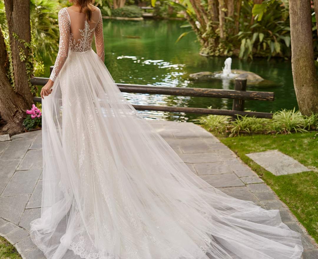 Meerjungfrauen-Kleid im barocken Stil. Dieses Kleid ist besetzt mit Spitze und verzaubert mit dem tiefen Ausschnitt und Rücken mit Illusionseffekt. Besonders elegant wird das Kleid durch die langen Ärmel.