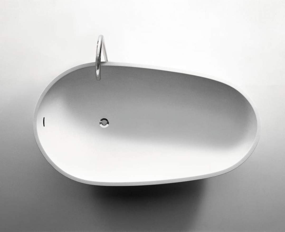 Die Spoon Badewanne aus weißem Cristalplant® biobased oder zweifarbig mit einer grauen Außenseite mit Überlaufloch, ohne Hahnlöcher überzeugt durch ihre natürlche und ovale Form. Die zusätzlich erhältlichen Wasserhähne können an der Wand oder am Boden montiert werden, außerdem muss die Badewanne mit einem Siphon ausgestattet sein. Die Spoon Badewanne von Agape überzeugt durch ihr minimalistisches Design und ist in drei Größen erhältlich.