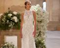 Langes Meerjungfrauen-Brautkleid im Ibiza-Stil. Aus Guipure-Spitze gefertigt, mit Neckholder-Ausschnitt und tropfenförmigem Rücken. Ein zartes Alma Novia-Design.