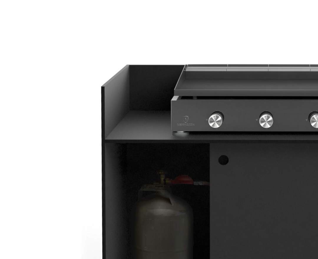 Material HPL.Die vertiefte Stellfläche des HEAT hat einen guten Grund. Hier finden die gängigen Einbau-Gasgrills Platz. Über eine Aussparung in der Platte lässt sich der Gasschlauch in das Innere des Moduls führen, wo er sich an eine handelsübliche Gasfl asche anschließen lässt. Raffinierte Schiebetüren bieten höchsten Komfort und runden die puristische Formensprache der TICINO-Serie ab.