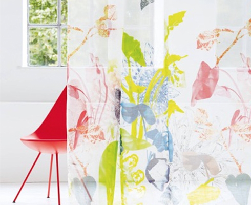Transparenter Vorhangstoff; Fantasievolle Blätter und Pflanzengebilde wachsen farbenfroh und märchenhaft auf transparentem Grund empor. Das freie Spiel mit Formen und Farben ist als nach oben auslaufende Bordüre angelegt.