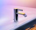 IMO von Dornbracht vereint zwei vorherrschende formale Ausdrücke, indem es einen runden Körper mit einem rechtwinkligen Hebel und