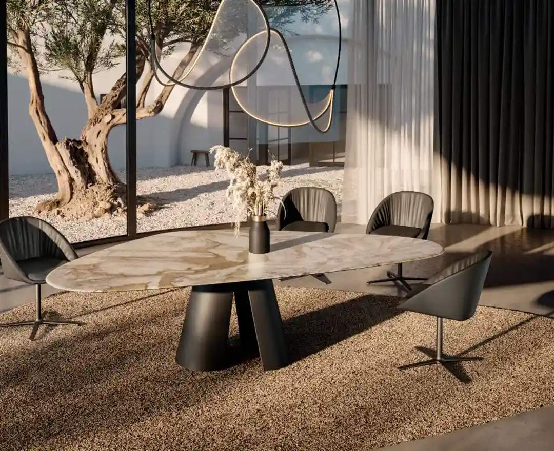 Erleben Sie mit dem Esstisch Kent von Draenert eine neue spannende Art, das Esszimmer zu gestalten. Die teilweise asymmetrischen Tischplatten schaffen innovative Sitzanordnungen und eröffnen damit völlig neue Perspektiven für Ihre Gäste. Die Steinausführungen des Kent-Tisches wirken durch die Asymmetrie der Tischplatten noch edler und vermitteln durch ihre einzigartige Maserung und Farbigkeit ein beeindruckendes ästhetisches Erlebnis. Dieses Tischkonzept bricht mit der routinemäßigen Symmetrie und eröffnet neue inspirierende und kommunikative Situationen für Ihre Esszimmereinrichtung. Der Unterbau des Kent besteht aus zwei Halbschalen aus Aluminiumguss, die zusammen mit jeder Tischplattenform eine skulpturale Gesamtanmutung schaffen. Dies verleiht dem Esstisch Kent von Draenert eine leichte und filigrane Erscheinung, die jeden Raum bereichert und zu einem ästhetischen Highlight macht. Die Tischplatte ist in drei unterschiedlichen Formen und diversen Größen lieferbar, was Ihnen eine individuelle Anpassung an Ihre Raumgestaltung ermöglicht.