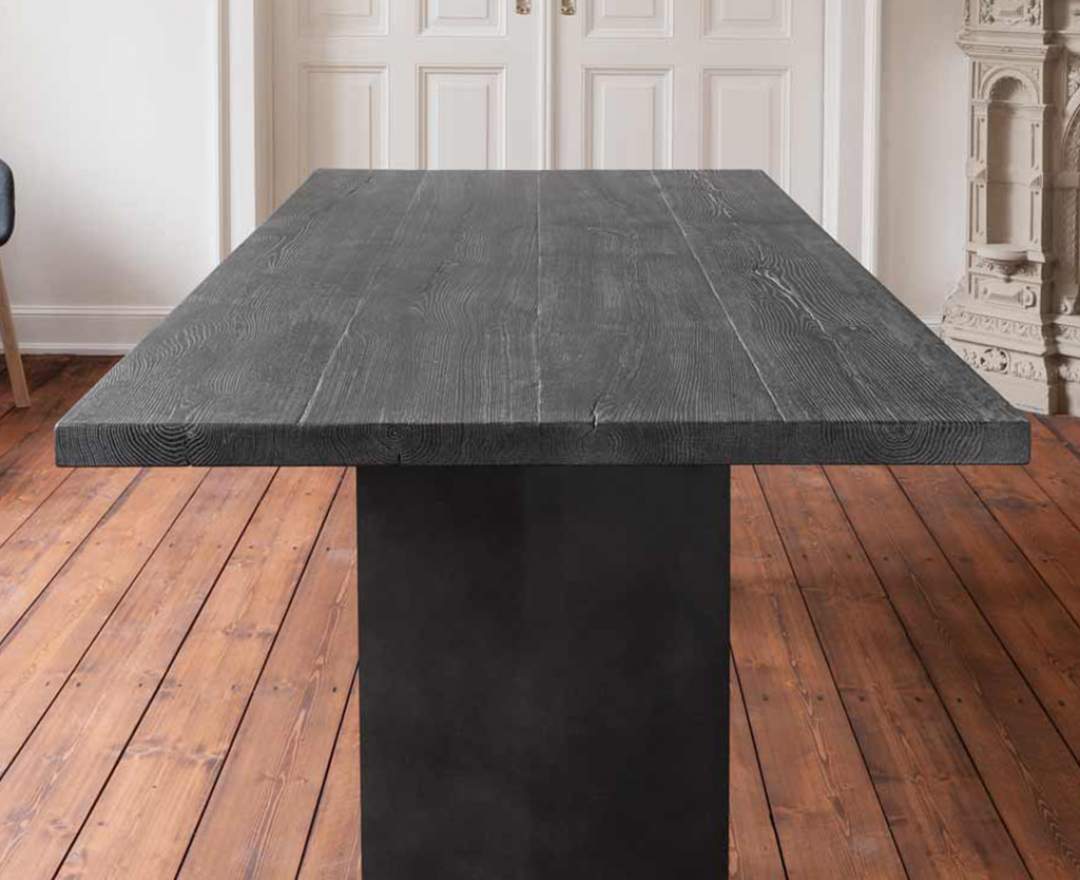 Die Holzoberfläche ist stets stark gebürstet und mit einer V-Fuge zwischen den einzelnen Bohlen versehen. Ganz besonders gut passt zu dieser Tischserie die geköhlte Oberfläche. Mit Feuer werden Risse und weiche Jahres ringe ausgebrannt. So entsteht eine interessante Oberflächenstruktur. Nach
