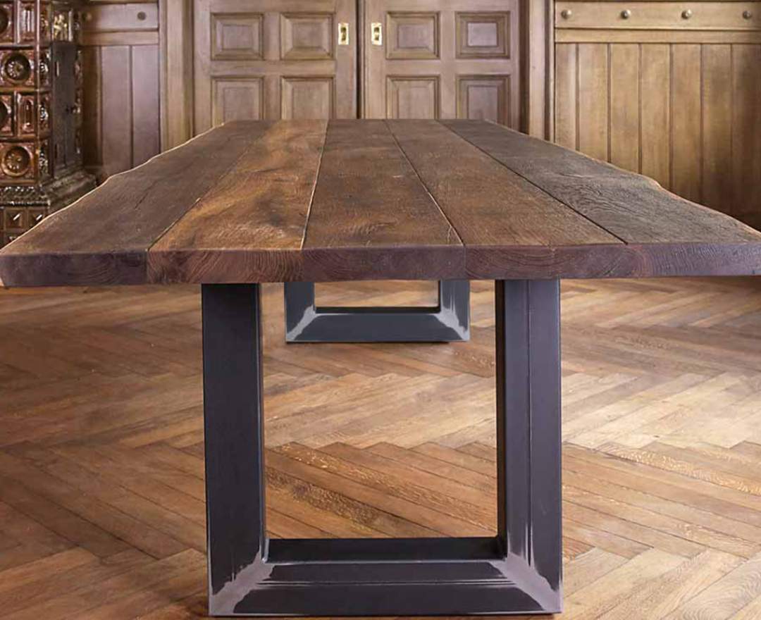 MAMMUT ist eine außergewöhnliche Tischkollektion, gefertigt aus urigen Kernholzbohlen der Eiche. Größere Äste, Risse, Vertiefungen oder auch leicht gekrümmte Bohlen sind materialtypisch.