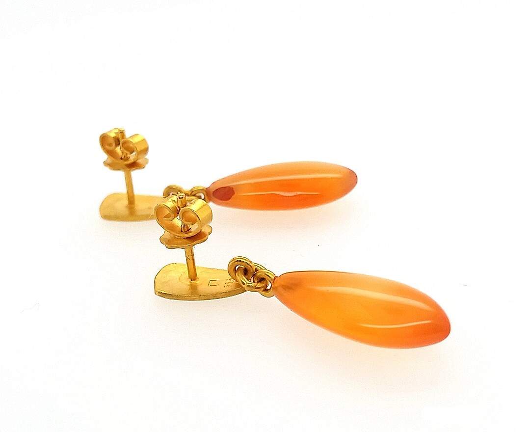 Dieser handgefertigte Ohrschmuck aus dem Flensburger Goldschmiede - Atelier Trapez von Birgit Johannsen fängt den Blick durch die leuchtend orangefarbenen Karneol - Tropfen.
