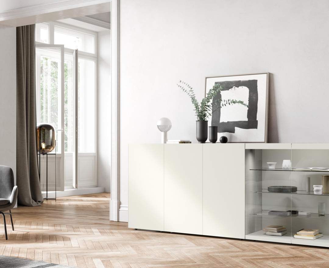Bei der Ausführung mit superfeinen, nur 3 mm breiten Fugen zwischen den Fronten und feinen Seitenwangen steht ganz das edle Material im Vordergrund. Module in 6 Breiten und 11 Höhen bieten viele Planungsmöglichkeiten als Sideboard, Vitrine, hohe Stauraum-Möbel und ausgefallene Solitäre. Verschiedene Untergestelle und Rundfüße passen die Wunschkreation jedem Raum nach Maß an.