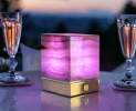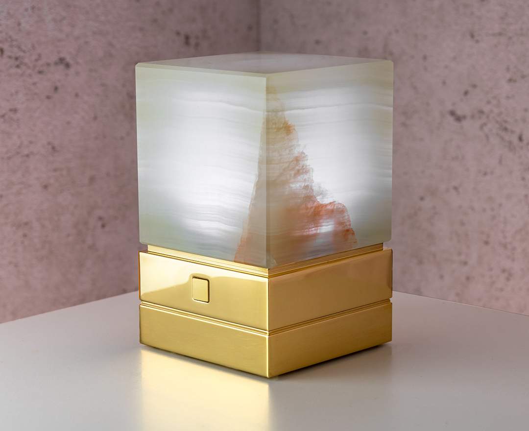Ein sinnliches und bezauberndes Lichtobjekt, geformt durch klares Design und gefertigt aus natürlichen Materialien: ITSU kombiniert auf brillante Weise den eleganten massiven Metallsockel mit einem Würfel aus warm strahlenden Onyx-Marmor.