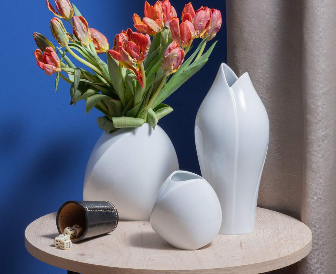 Die "Fischmaulvase" ist eine Neuerung im Repertoire der Manufaktur. Die Form der Vase, ein bauchiger Körper mit einer kleinen geschwungenen Öffnung, stellt einen aus dem Wasser springenden Fisch dar. Eine scharfe Kante durchzieht geradlinig die gesamte Länge der Vase und trennt sie in zwei Hülsen, von denen eine die andere, leicht nach innen versetzte, fasst. Langstielige Pflanzen und Blumen wie Amaryllis, Ilex- oder Tannenzweige finden in der hohen Form idealen Halt. Dabei stehen die großzügigen weißen Flächen der Vase im strahlenden Kontrast zu sattem Tannennadelgrün und weihnachtlichem Rot.