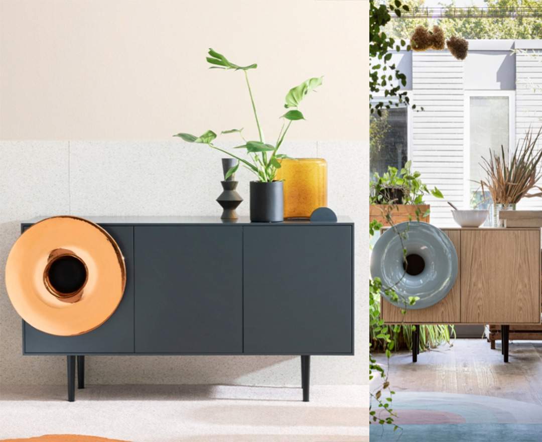Das Sideboard Caruso lädt Sie ein, Platz zu nehmen, eine Pause einzulegen und die Magie der Musik in Ihre Räume einziehen zulassen. Die Gestaltung steht am Rand der Ironie, ein wenig futuristisch, ein wenig nostalgisch, und schafft es, High-Tech mit dem Wohnen zu verbinden.