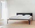 Eine beinahe schwebende Liegefläche wird von vier filigranen Stahlbeinen getragen. Um sie sicher zu fixieren, sind die Beine mit dem Rahmen durch Seile verbunden. Auf dieser eleganten Konstruktion ruht die Matratze wie auf einem Tableau. Zusätzlich kann der Rahmen nach Belieben erweitert werden, um Platz für Wecker, Bücher oder das Frühstück im Bett zu bieten. Um noch mehr Komfort zu gewährleisten, kann das Bett optional mit einem Kopfteil ausgestattet werden.