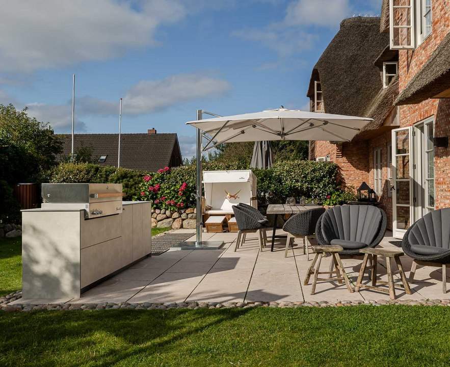 Entdecken Sie die perfekte Kombination aus Design und Funktionalität mit der exklusiven OUT4KITCHEN Outdoor-Küche, installiert auf der malerischen Insel Sylt. Diese maßgeschneiderte Outdoor-Küche fügt sich nahtlos in das elegante Ambiente eines Ferienhauses mit Backsteinfassade und Reetdach ein und ist ideal für alle, die das Kochen im Freien auf höchstem Niveau genießen möchten.