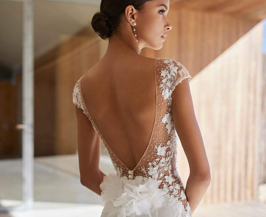 Zweiteiliges, sexy Meerjungfrau-Brautkleid aus elastischem Kreppstoff kombiniert mit Spitze und Strass. Mit Herzausschnitt, V-Rückenausschnitt, kurzen Ärmeln und Schleppe aus Spitze und Strass. Abgerundet wird es durch eine abnehmbare Schleppe aus Tüll. Traumhaftes Ensemble von Rosa Clará.