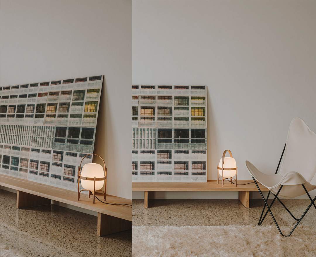 Die kleinere Version der Cesta-Lampe zeichnet sich durch eine kleinere Holzstruktur aus, die immer sorgfältig poliert und stabil zusammengebaut ist und die kleine Opalglaskugel hält, in die das Licht gehüllt ist. Dieses Design, eine Objektlampe, schafft überall, wo sie platziert wird, Räume des Vergnügens und zählt zu den meistbeachteten internationalen Ikonen ihres Schöpfers.