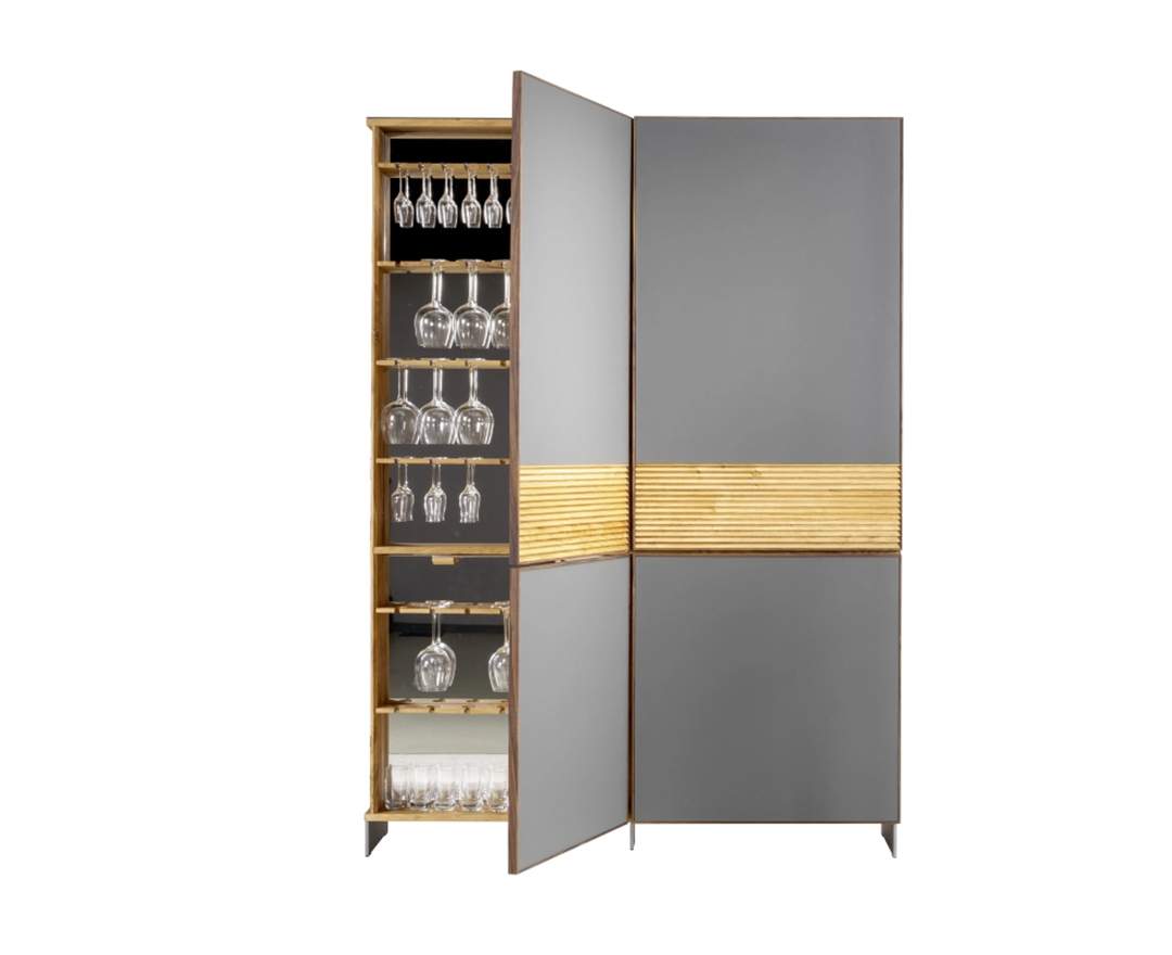 Der Geschirrschrank Tratum von Scholtissek überzeugt mit einer filigranen Massivholzfront in Lamellenstruktur, die eine leichte, horizontale Optik schafft. Ein Highlight ist das seitlich herausziehbare Barfach mit Spiegelrückwand. Mit Maßen von B 150 cm, H 207 cm und T 44 cm bietet er großzügigen Stauraum und fügt sich harmonisch in verschiedene Raumkonzepte ein. Erhältlich in edlen Holzarten wie knorriger Eiche, Astnuss, Wildkirsche und Nussbaum.