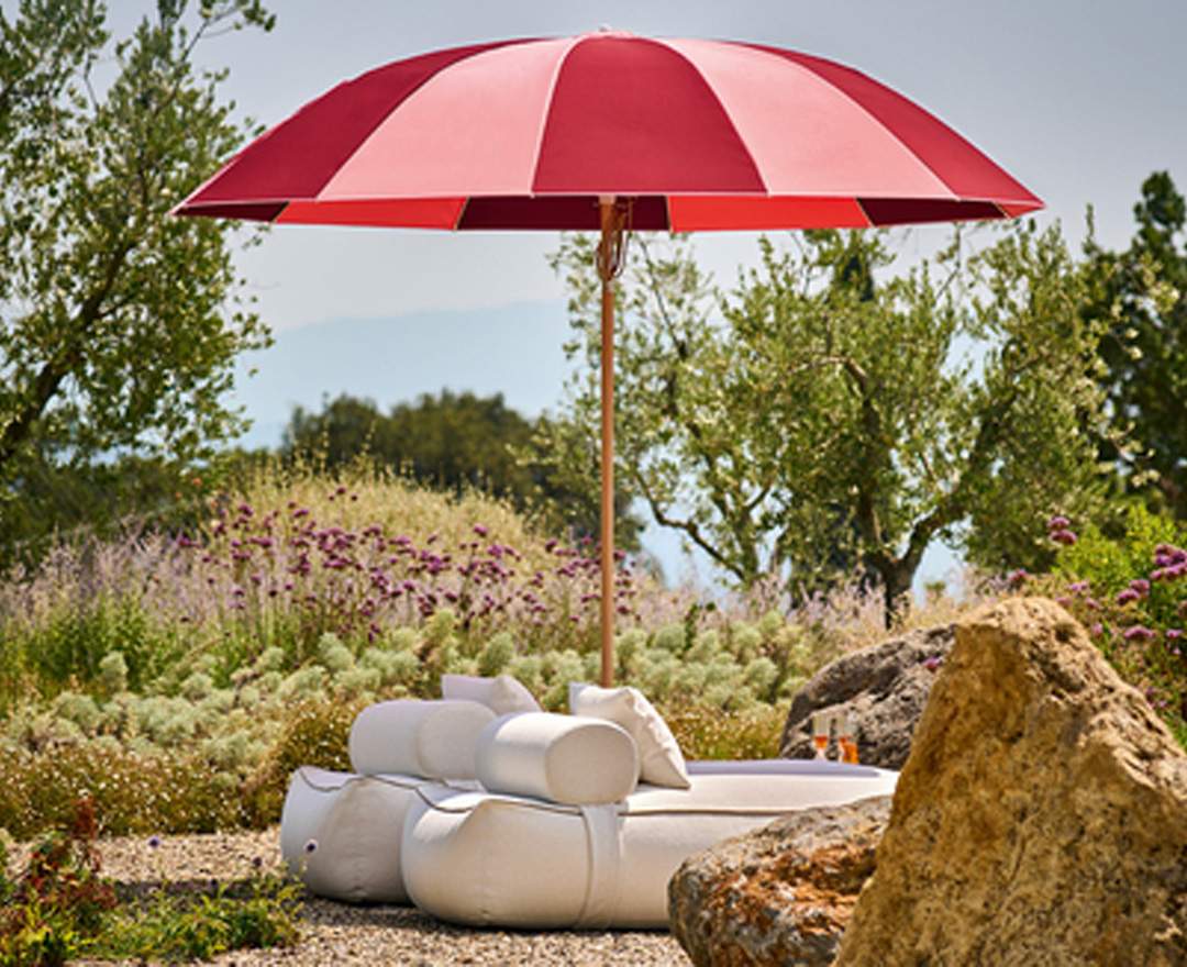 Natürlich wurde der PAGODENSCHIRM für sonnige Tage konzipiert und ist mit einem Schirmmasten aus pulverbeschichtetem Aluminium oder lackiertem Hartholz erhältlich. Er ist in zwei verschiedenen Größen verfügbar, wobei der kleinere auch über eine Knickfunktion verfügt. Die Bespannung wird von Fiberglasstäben und Naben aus Polyamid getragen, während ein Flaschenzug das mühelose Öffnen ermöglicht. Für noch mehr Vielseitigkeit ist der kleinere PAGODENSCHIRM mit weißem Gestell auch mit einem Kurbelmechanismus erhältlich, der das Öffnen und Knicken zum Kinderspiel macht!